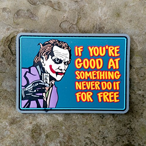 -. Binding : Misc. -. Brand : NEO Tactical Gear -. Color : OD -. EAN : 0070449269740 -. Feature : JOKER PVC Rubber Morale Patch by NEO Tactical Gear - High Quality Morale Patch - Hook Velcro Sewn On Back / PATCH DIMENSIONS 3.5"x2.5". Great for fans of Batman and Joker, airsoft and to decorate any loop velcro surface. / MORALE PATCH COMES shipped in NEO Tactical Gear resealable retail packaging. Packaging is great to store your patches in when not being used. / ADD THIS MORALE PATCH to your collection today! / BUY WITH CONFIDENCE satisfaction guaranteed. If you are not fully satisfied with the quality of our patch or the design, we will refund 100% of your money. -. IsAutographed : 0 -. IsMemorabilia : 0 -. Label : NEO Tactical Gear -. Manufacturer : NEO Tactical Gear -. PackageQuantity : 1 -. ProductGroup : Sports -. ProductTypeName : SPORTING_GOODS -. Publisher : NEO Tactical Gear -. Studio : NEO Tactical Gear -. Title : Joker If You're Good At Something Never Do It For Free - Batman PVC Morale Patch - Hook Backed by NEO Tactical Gear -. UPC : 070449269740