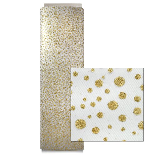 The Glitter Dots Tulle is a fine quality tulle with printed glitter dots throughout. This 54" wide polyester tulle is fantastic for celebration decorating, wedding accessories, floral arranging, packaging and making fun accessories like tutus and costumes. This is a 25 yard bolt.Feature