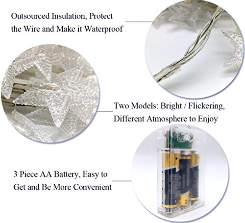 -. Feature : Cost effective and energy efficient. The LED String Starry Light will not overheat after many hours of usage. / Weatherproof Star String Lights: Warm white-yellow Mini leds strings creates a warm, joyful, and festive ambience to delight your Christmas ,holiday or wedding. / High quality copper wire that is thin and flexible and coiled with paper tub so it will never make a mess, easy storage and ready for next use, reel in the string lights to keep it tidy, organized and easy to be untied. / Energy-saving LED bulbs safe to touch after many hours of use, Highly protective security to guaranteed of no scalding even in circumstances that those elderly and children accidentally touch it / 2 Modes setting(bright/flickering), easily operated by 3 pieces of AA batteries(batteries are not included)