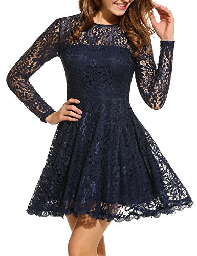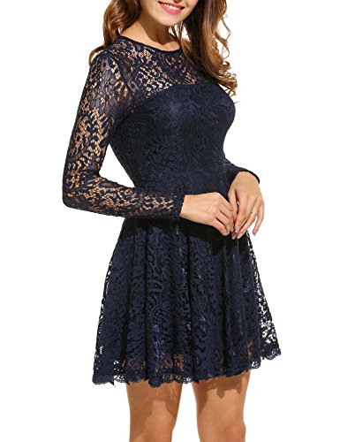 Long sleeve o-neck lace swing dress with eyelash brim backless design, easy to show your curve and make you elegant