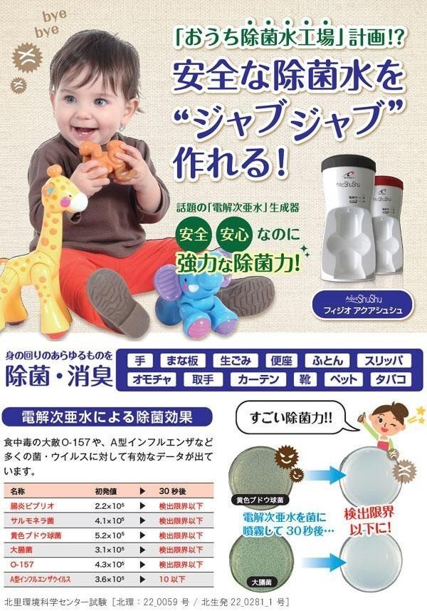 | 水道水とたった0.3gの塩で何度でも除菌水(電解次亜水)が作れます。手の除菌はもちろん、子供のおもちゃやまな板の除菌など、様々な場所で使用可能です。 |
