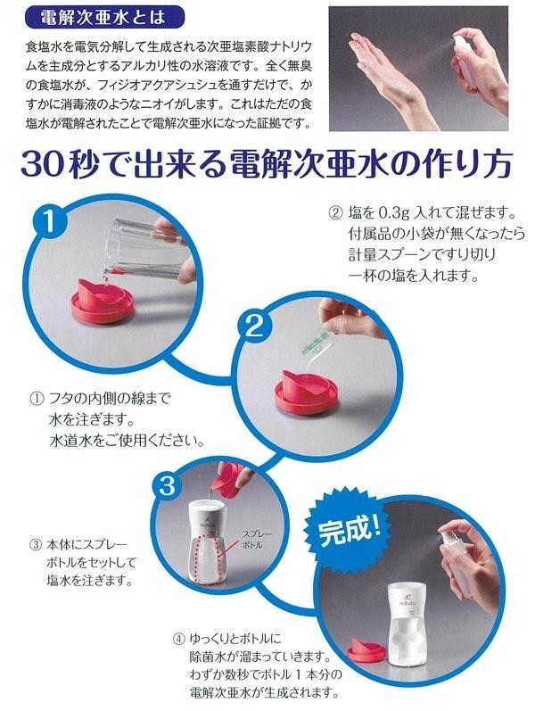 水道水とたった0.3gの塩で何度でも除菌水(電解次亜水)が作れます。手の除菌はもちろん、子供のおもちゃやまな板の除菌など、様々な場所で使用可能です。 |
