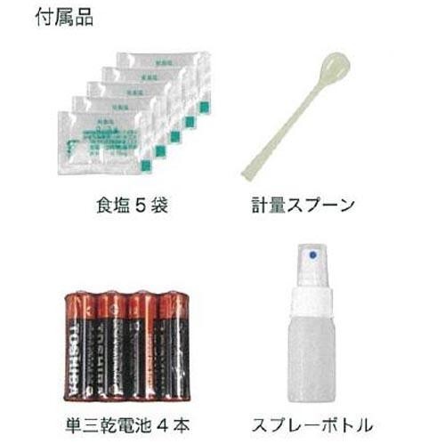 | 付属品 | 食塩5袋、計量スプーン、単3乾電池4本(テスト用)、スプレーボトル1本 保証書(保証期間:1年) |