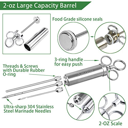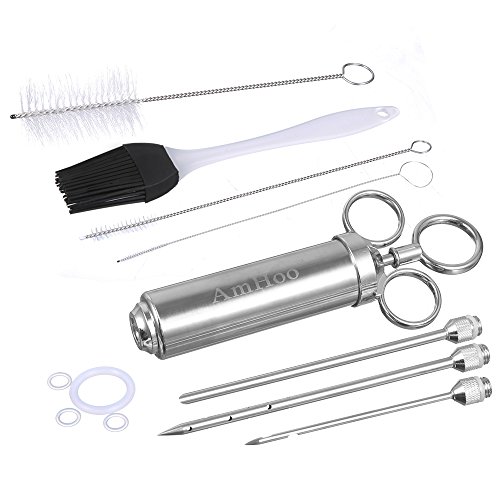 AmHoo Barbecue Meat Injector,Food Grade 18/10(304) Stainless Steel Meat Injector Pump-100% Food Safe With 2-oz Capacity Barrel 3 Marinade Flavor Needles-Free Cleaning Brush+Oil Brush