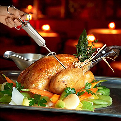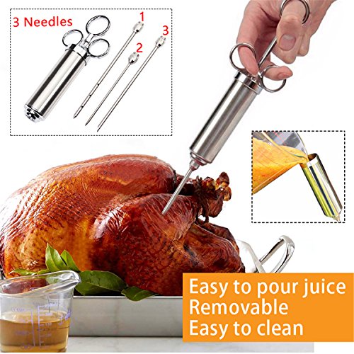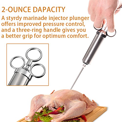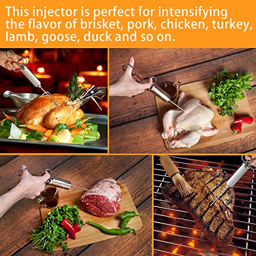 - More Tasty & More Juiciest For Any Meat:this meat injector is perfect for keeping meat moist and tasty and improves the flavor of brisket, pork, chicken, turkey, lamb, goose, duck, and more! Durable and the needles inject any meat or poultry easily,Cook sumptuous flavored mouth watering tender meat by injecting your favorite flavor by meat injector.No more dry, bland and flavorless meat form now