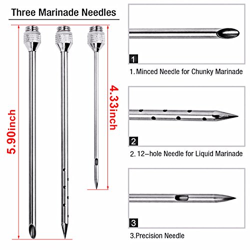 - 2.Marinate Quickly:The sets of needles are complete with professional 3 specialized marinade injector needles for precision marinade injection into any cut meat size. a 6-inch with 12 holes needle for fast even distribution of liquid marinade into larger meat.a 6-inch open-ended needle for injecting chunkier marinades such as minced garlic or herbs into larger cuts of meat.a 3-inch 2-hole steak needle for liquid marinades into small meat and kebabs