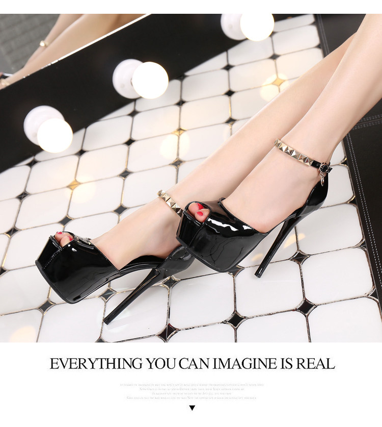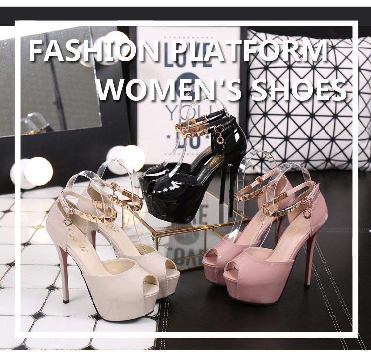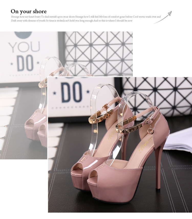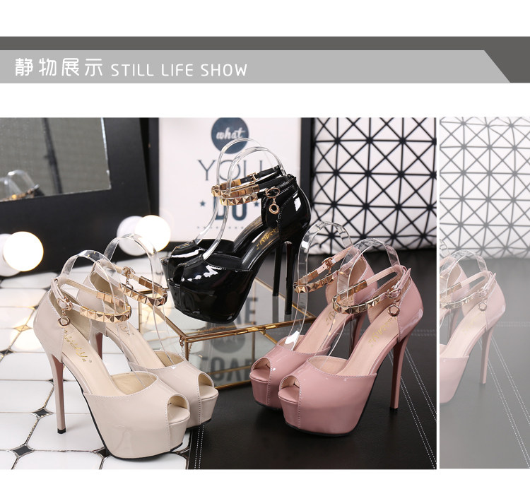 夏季性感金属一式扣带凉鞋女14CM超高跟细跟防水台夜店鱼嘴鞋