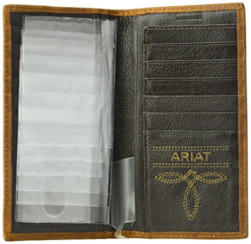 Studio : Ariat Publisher : Ariat Binding : Apparel Product Description This medium brown Ariat rodeo wallet by medium and f western products has a beautiful Aztec design around the edges with a white accent border stitching. Inside features multiple compartments for your credit cards, cash, and an id window. 0