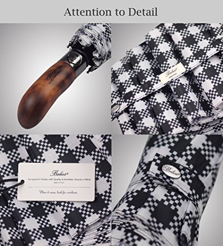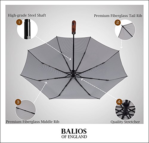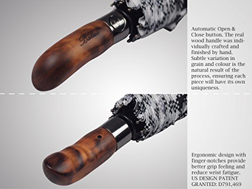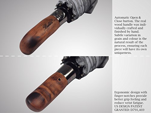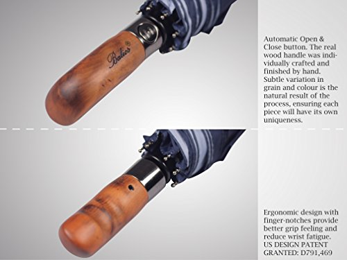 What makes Balios umbrella a great umbrella? There is really no magic about it - it is merely patient attention to detail. Pick up a Balios umbrella and you will immediately sense that it is a different kind of umbrella. With its sturdy frame construction and exquisite design, our Balios umbrella is the perfect combination of durability and metropolitan style. This design also comes with a 100% handmade real wood handle (US design patent granted). An ultimately luxury umbrella with classic appeal and contemporary aesthetic. Main Features: ?Revolutionary construction designed to battle the elements: high grade black hardened steel shaft for a heavy-duty foundation unique thickened premium fiberglass wind-resistant frame system, offering great durability.