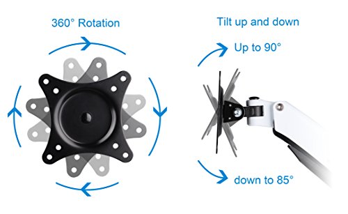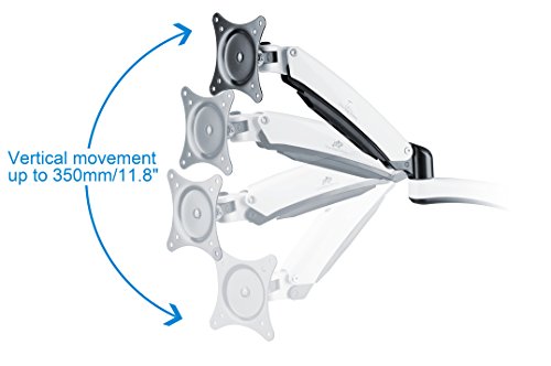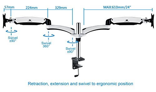Dual arms extend up to 24”, retract back, swivel right and left to set screens to ergonomic positions. Lift and lower up to 11.8”/350mm height adjustment, with gas spring system’s counterbalance to the weight of the monitor.
