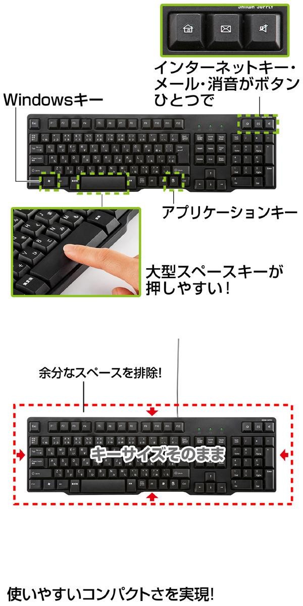 余分なスペースを排除したコンパクトデザイン!しっかりとした深い押し心地のメンブレン方式です。インターネット・メールソフト・消音が一発で使える便利な機能付き。