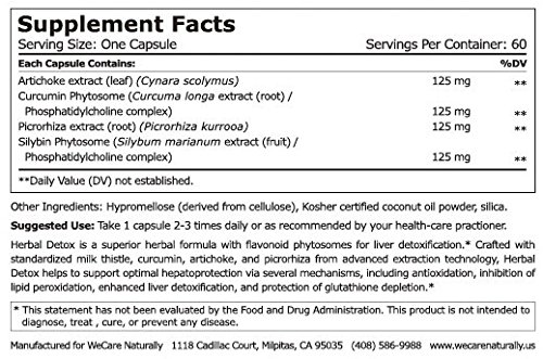 -. Binding : Health and Beauty -. Brand : WeCare Naturally -. EAN : 0858849003030 -. Feature : Provides superior hepatoprotective herbal formula with flavonoid phytosomes for enhanced absorption. / Promotes liver health for exposure to toxins, detoxification and cleansing / Formulated by doctors with milk thistle, curcumin, artichoke, and picrorhiza. / Best if used with Super Detox for optimal liver function health. / A Supplement that really works - WeCare Naturally proudly formulates this Superior supplement in an FDA-registered facility that is NSF and GMP certified, and all products are manufactured in the USA. -. Label : WeCare Naturally -. Manufacturer : WeCare Naturally -. ProductGroup : Health and Beauty -. ProductTypeName : HEALTH_PERSONAL_CARE -. Publisher : WeCare Naturally -. Studio : WeCare Naturally -. Title : Herbal Detox (60 Vegetarian Capsules), Advanced Herbal Formula with Optimal Liver Functions -. UPC : 858849003030