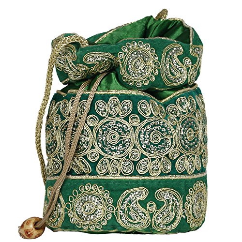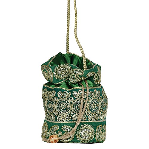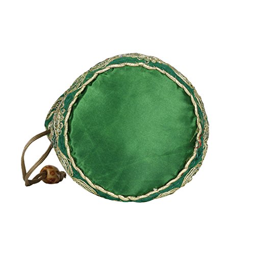 -. Title : Indian Satin Potli Bag with Attractive Handicraft Thread Work for Female-Green