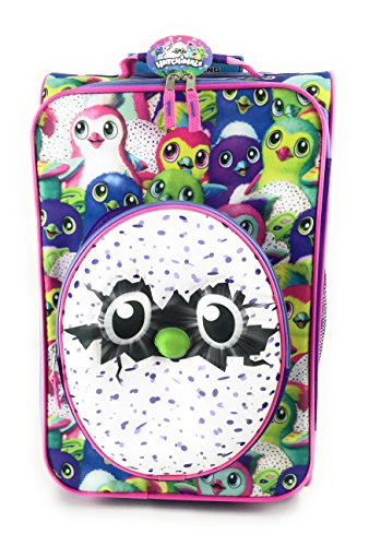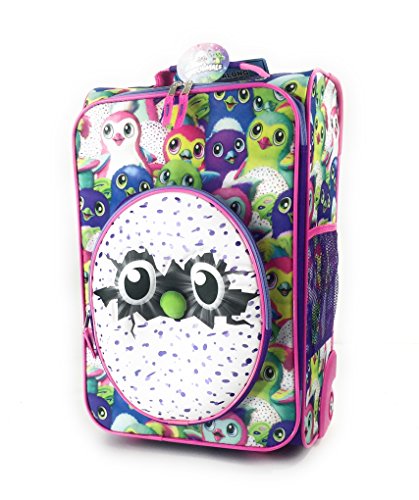 Product Description Spin Master Hatchimals Rolling Luggage 18"X12" x7.5". Carrie along luggage strap. Top handle on children's bag can be stored in zippered pocket when attached to parents bag. Convenient strap to attach child's luggage over adult luggage handle. Separate front zippered pocket for easy storage. Side mesh pocket. Easy two wheel rolling. 0