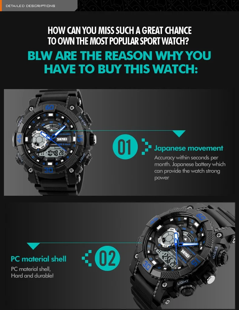 Feature:Water Resistant,LED display,Multiple Time Zone,Stop Watch,Auto Date,Back Light,Complete Calendar,Shock Resistant,Alarm