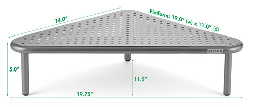 -. Feature : Space saving corner design raises your monitor 5 inch to a comfortable and ergonomically correct viewing height to reduce neck strain / Unique shape fits neatly into desk corner to maximize workspace, great for smaller work spaces / Stow laptop or documents underneath to keep desk clutter-free / Made of powder coated steel with perforated hole pattern for passive airflow. Keeps your electronics cool / Design allows you to comfortably use a laptop computer with a separate keyboard and mouse. / Great for monitors, laptops, P.R.Inters, TVs, gaming consoles, DVD players, stereos upto 40 lbs/18 kg / Sturdy platform measures 19 in (w) x 11 in (d) / Product Dimensions 19.75 in (l) x 11.5 in (d) x 5.0 in (h)
