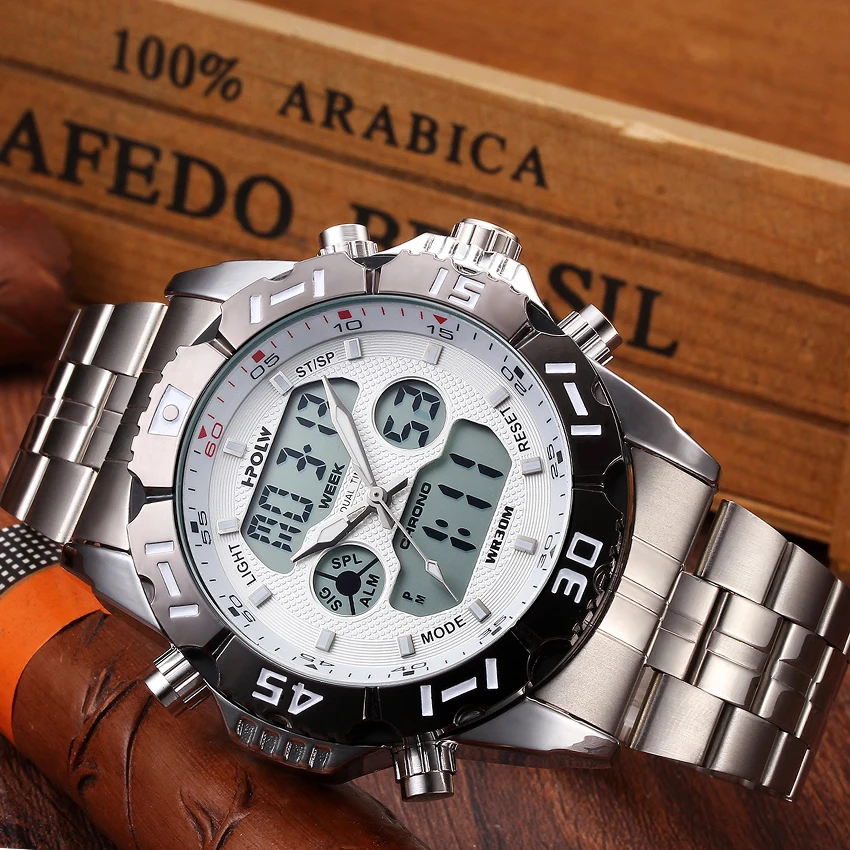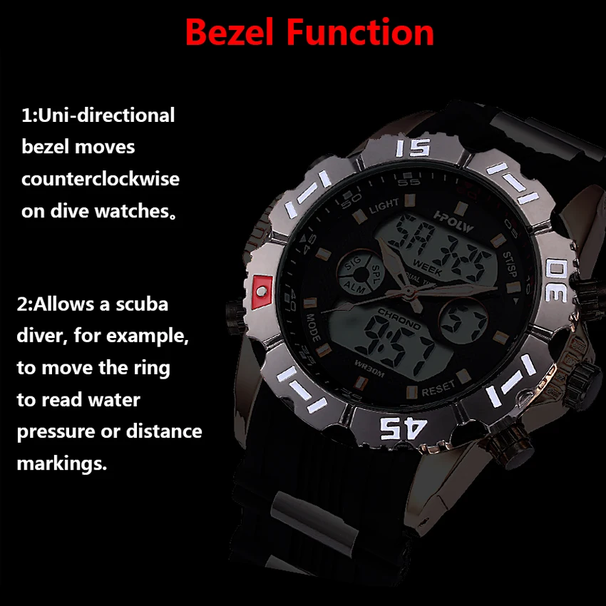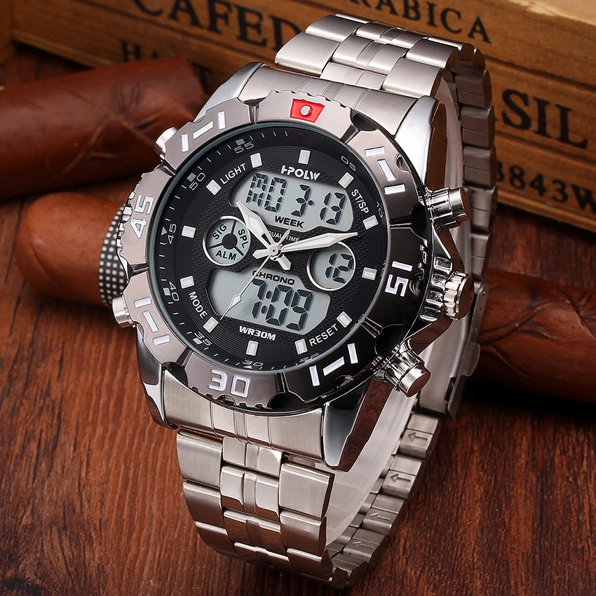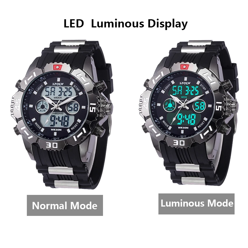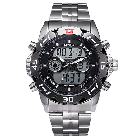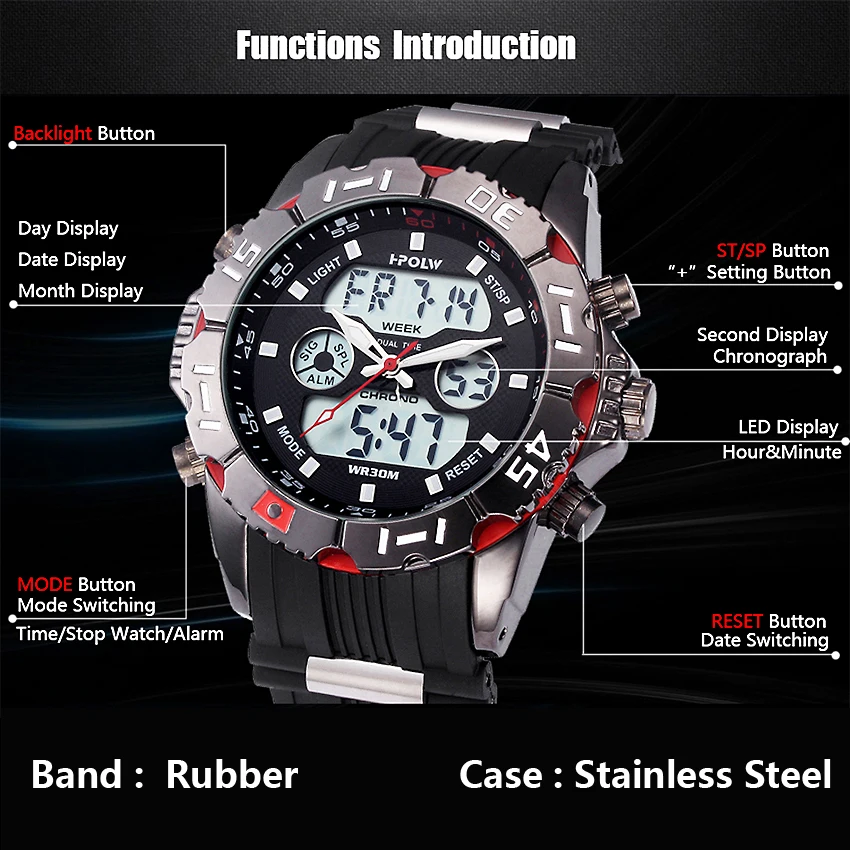 Feature:Water Resistant,LED display,Multiple Time Zone,Stop Watch,Back Light,Complete Calendar,Shock Resistant,Chronograph,Auto Date,Anti-magnetic,Alarm