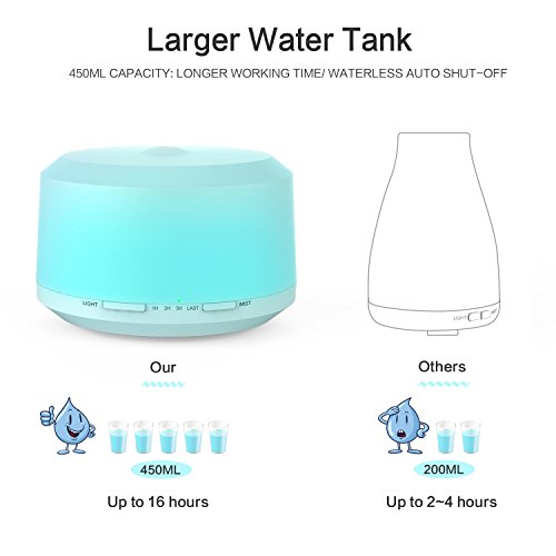 - 💝Large Capacity💝 The 450 mL water reservoir lets you operate the diffuser all night with no worries shutting off when it is out of water. The essential oil diffuser can run for 10 hours in the continuous mode and can aromatize a room of approximately 320-square feet.