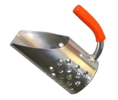 Here is our best selling aluminum sand scoop. it is Ultra lightweight & very easy to use. The aluminum bucket has 5/8" diameter holes punched into the sides & the back of the scoop. The bucket of the sand scoop is 5" in diameter by 7" long. The anodized handle is welded to the top of the sand scoop.