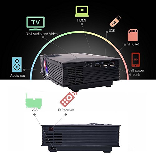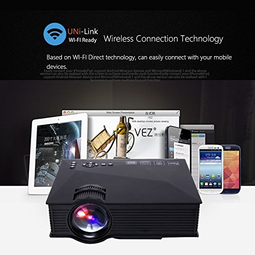 - Feature : Updated model DeepLee UC46, WIFI Inside 1200 lumen can provide crystal clear image in dark environment. You can connect your iPhone/iPad/Android device/Mac wirelessly with the projector's UNi-Link OS via WIFi. No need wires. If wireless display can't work normally, please contact us, we will send you detailed instructions (NOTICE: UNi-Link OS is compatible with above Android4.2.2, IOS6.0 and Win8.1 system. When you use it please confirm a good network condition) / Native Resolution: 800x480; Brightness:1200 Lumens; Contrast: 800:1; Aspect Ratio: 4:3/16:9; Image size 36-130 Inches(Recommend Distance 8.0 ft, best Projection Size: 80-120 inches);Please install 2 batteries in remote control and make sure the signal transmitting terminal of the remote control aims at infrared signal receiver of the projector during the operation / Many kinds of input ports(VGA/HDMI/USB/SD Card); You can watch your favorite programs with 120 inches screen via VGA/HDMI/USB/SD Card; Connect your PC / Laptop / DVD Player to enjoy videos or movies. Connect Playstation PS3 PS4 or X-Box ONE Wii via HDMI port to enjoy games on so big screen / NOTICE: Due to the copyright issue of Dolby, this projector does not support Dolby's Audio decoding. Please turn off the Dolby voice or you might not get sound from videos( Especially in Netflix videos) For perfect sound, we recommend customer connect an external speaker(Via the 3.5 mm headphone jack, or via the 3-In-1 audio&video port) / This DeepLee UC46 is not recommended for PPT/WORD or business presentation, ideal for home theater movies and video game use! It is also good for football or basketball match at home or movie night in the courtyard