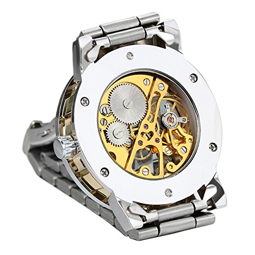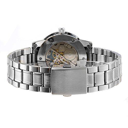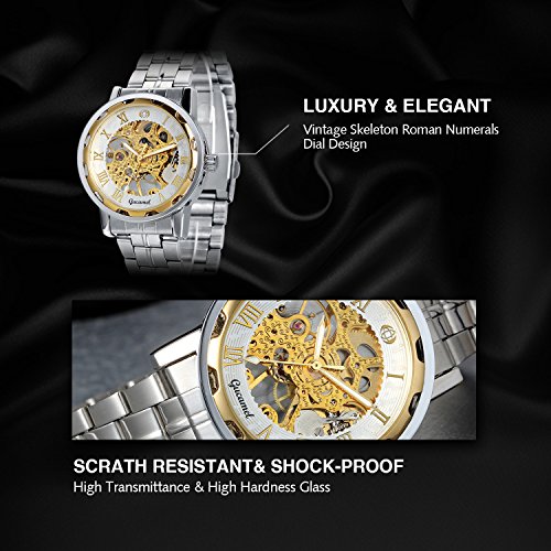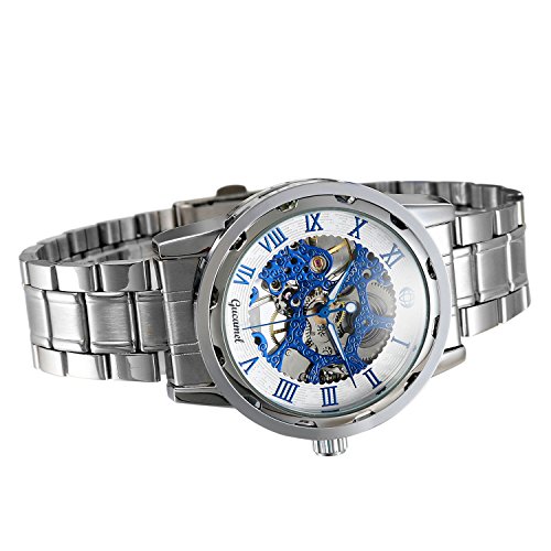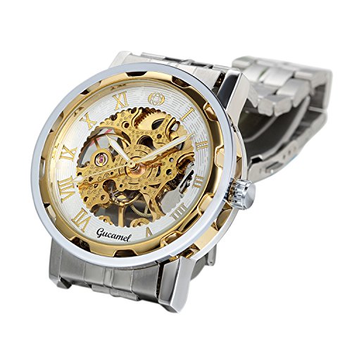-. Feature : VINTAGE DESIGN: steampunk skeleton mechanical watch, roman numerals dial design / EASY READING: Analog Roman Numerals Display / ELEGANT AND SAFETY: stainless steel band, folding clasp with safety, easy to put on and take off, suitable for formal or causal occasion / WATER RESISTANT: Splashproof ONLY, please do NOT wear it when diving, swimming, snorkeling, water-related work or fishing