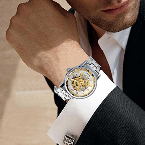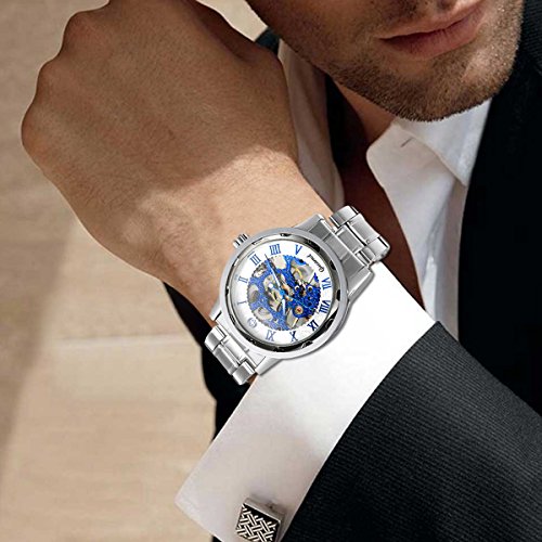-. Title : Avaner Mens Business Casual Stainless Steel Steampunk Skeleton Semi Mechanical Vintage Roman Numerals Analog Wrist Watch