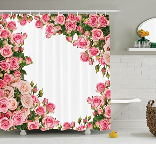 Ambesonne Roses Decorations Collection, Rose Bushes Frame Bridal Summer Park Occasions Decorative Artwork, Polyester Fabric Bathroom Shower Curtain Set with Hooks, Pink Green White