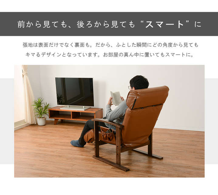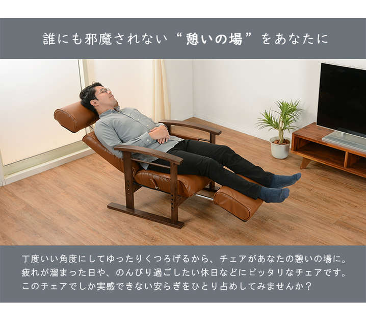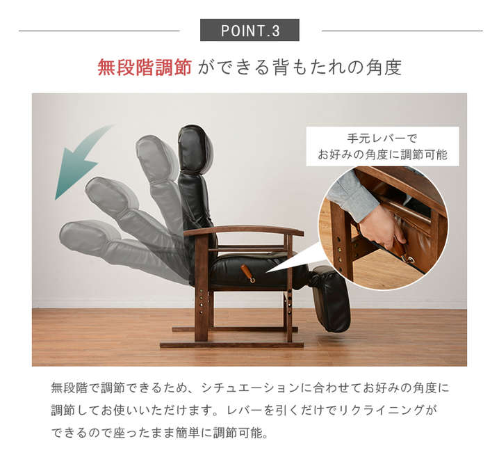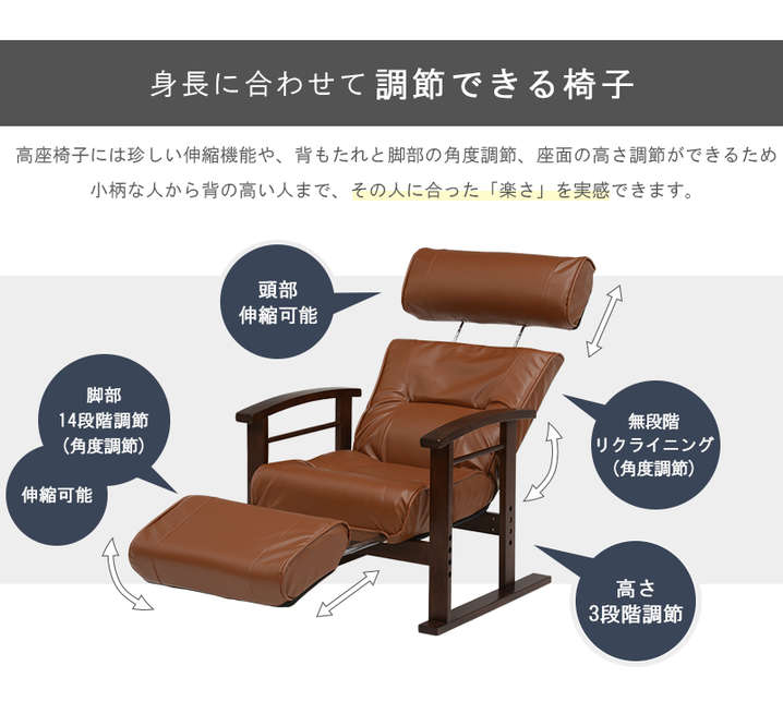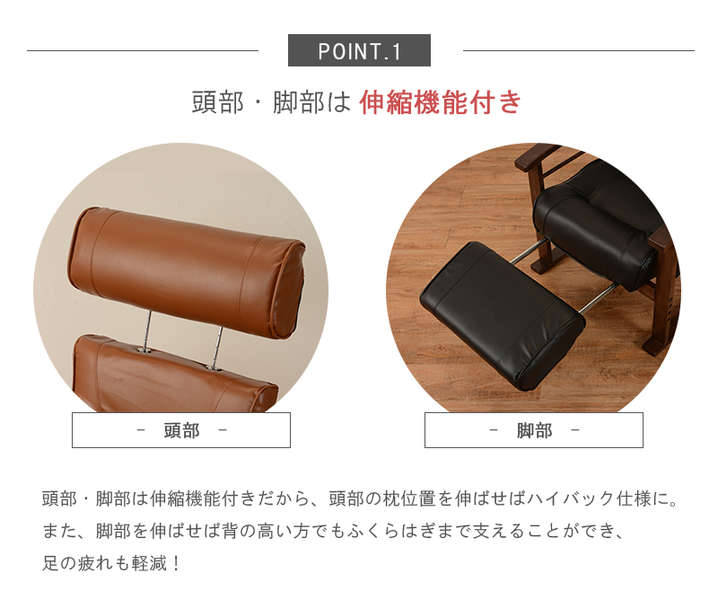 ●頭部、脚乗せ部が伸縮する極上の座りが体験できる高座椅子。背もたれは手元レバー無段階リクライニング、脚部は14段階リクライニング。