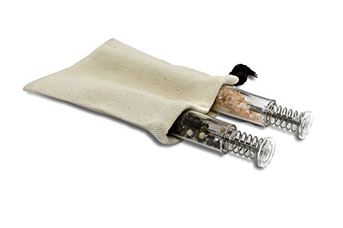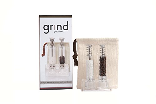 SALT AND PEPPER ON THE GO Grind Gourmet’s Original travel size salt and pepper grinder is great they fit in your purse, vehicle, boat, camping gear, office desk, backpack… Each mini salt pepper grinder set comes with it’s own stand, travel pouch and a sample size packet of sea salt and pepper to allow you to enjoy a healthy meal in an instant. Select from our signature polycarbonate set or stainless steel salt pepper grinder set.