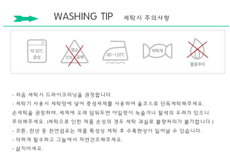 - 세탁방법 및 취급시 주의사항손세탁 권장 / 그늘에서 건조
