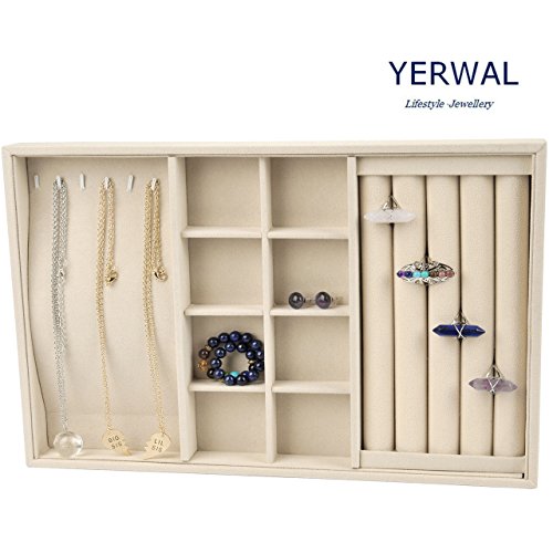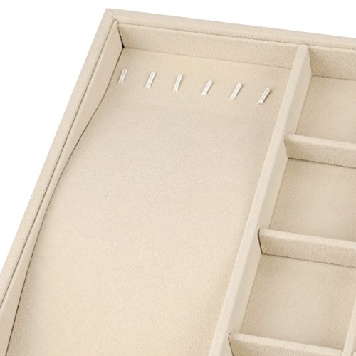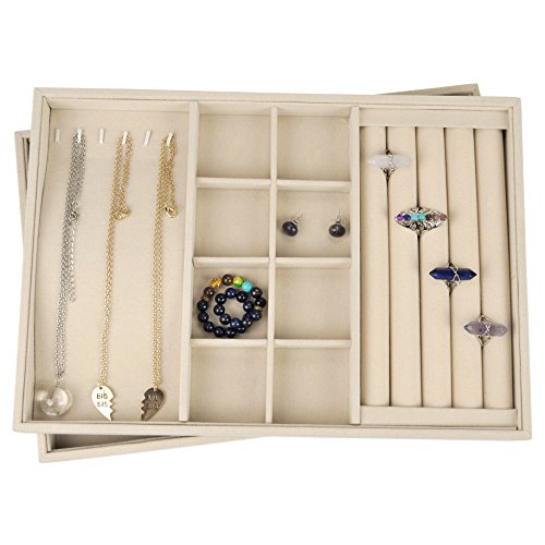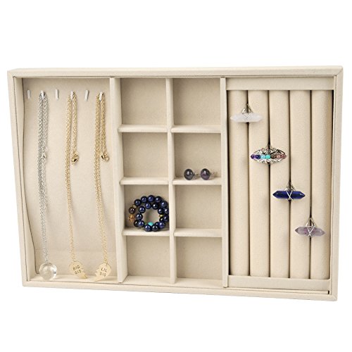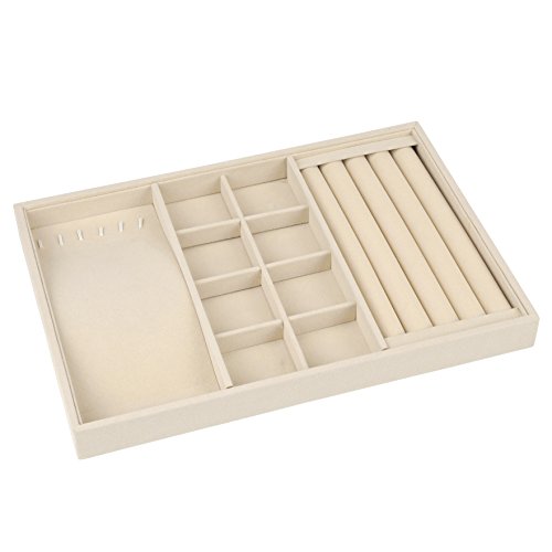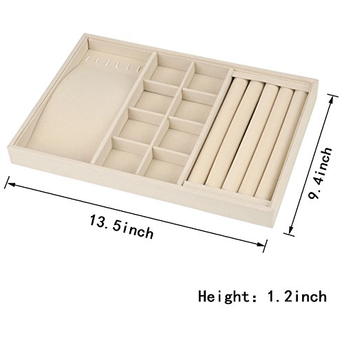 JEWELRY TRAY DIMENSION: 13.6" x 9.4" x 1.2". Ideal for small parts and supplies. Environmental protection,beautiful appearance,light weight,convenient collection. Conveniently Lined which Makes it Perfect for Rings, Watches, Bracelets and Necklaces and Easy to Access. Excellent Storage and Organization Tool for both Home and Office . DURABLE CONSTRUCTION: Constructed with sturdy composite board wrapped in Claimond Veins with removable compartment dividers to organize and protect your precious jewelries. FUNCTIONAL DESIGN: The sleek jewelry tray can be used to store earrings, necklace, bracelet, rings, watch and more. It helps to find you jewelry instantly and put your look together quickly. MULTI-SECTIONAL: Features 4 Slots Ring holder, 6 necklace organizer and 8 Grid Jewelry Tray Showcase. STACKABLE DESIGN: The jewelry tray can be stacked on your drawer or dresser to save space and to accommodate your growing collection.