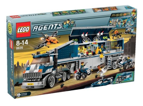 -. Feature : The task for special agent builders: Build super security measures into the mobile HQ to prevent his escape / Agent tip: Because a full attack is expected to unfold at HQ, use as many of the truck-based resources to ward off villain infiltration / The HQ center is equipped with in tell center, tool bay, repair shop, mini jet boat, / Includes five vehicles and seven minifigures / Contains 1,154 pieces / The HQ center is also equipped with video surveillance plane, disarming vehicle, mini boat, jet, radars, missiles and laser projector screen
