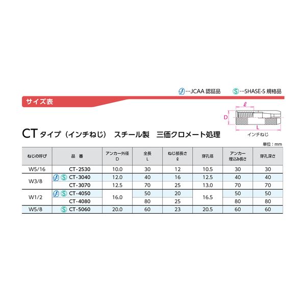 ●ねじの呼び:W1/2 全長:80mm ねじ部長さ:25mm 穿孔径:16.5mm アンカー 埋込み長さ:80mm 穿孔深さ:80mm アンカー外径:16mm