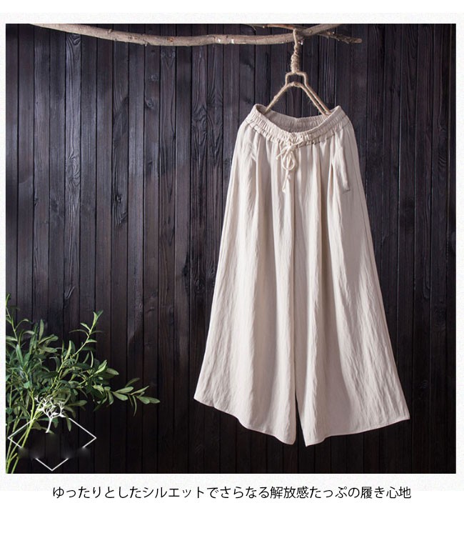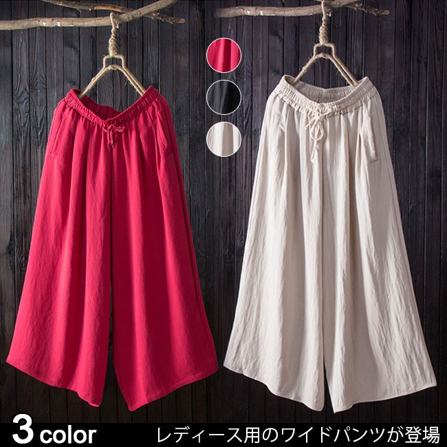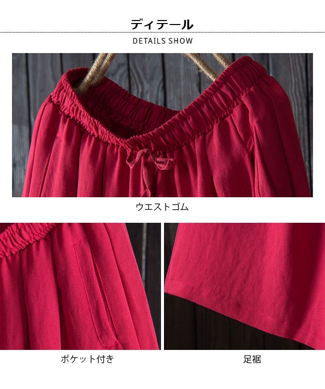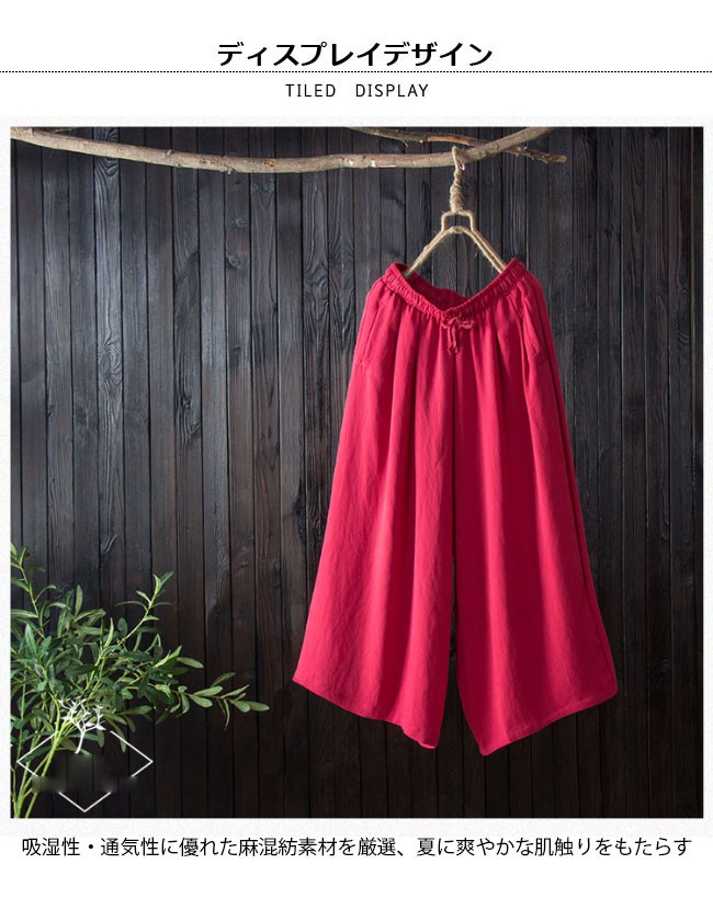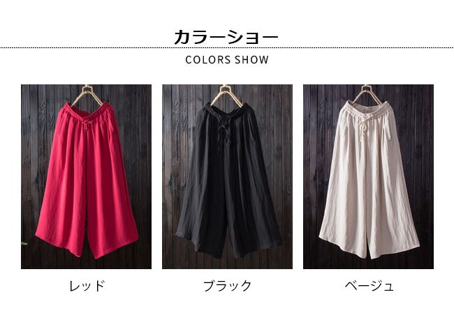 レディース ワイドパンツ リネン 九分丈 ウエストゴム 体型カバー 女性用 ガウチョパンツ ゆったり 九分丈パンツ 夏物 ボトムスレディース用のワイドパンツが登場吸湿性・通気性に優れた麻混紡素材を厳選、夏に爽やかな肌触りをもたらすゆったりとしたシルエットでさらなる解放感たっぷの履き心地九分丈の仕様で華奢な足首を強調大きめのサイズ感に腰部分はゴム仕様でより幅広い体型を対応できるシンプルなデザインに着まわしの効くカラバリで夏のコーデを気軽にこなせる一枚カラー:レッド ブラック ベージュ素材 麻混紡サイズ(cm) M L XLM 総丈83 ウエスト64-92L 総丈84 ウエスト66-94XL 総丈85 ウエスト68-96ご注意:※サイズは平置きサイズです。素人採寸ですので、若干の誤差がございます、ご了承ください。