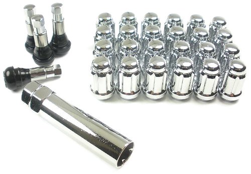 Kit includes 24 each 12 millimeter x 1.5 inch spline designed lug nuts with matching installation socket and 4 chrome valve stems