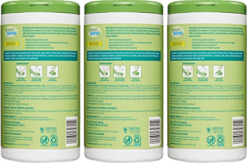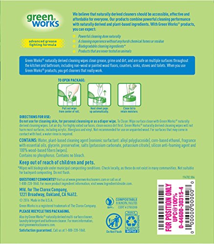 -. Binding : Health and Beauty -. Brand : Greenworks -. Feature : Three 62 count canisters of Green Works Compostable Cleaning Wipes, Original Fresh (Packaging May Vary) / Naturally derived / Powerful cleaning done naturally / Compostable (wipes will biodegrade under municipal composting conditions) / Safe for use on multiple surfaces throughout the home -. IsAdultProduct : 0 -. Label : Clorox Company -. Manufacturer : Clorox Company -. Model : 6319235 -. MPN : 6319235 -. NumberOfItems : 1 -. PackageQuantity : 1 -. PartNumber : 6319235 -. ProductGroup : Health and Beauty -. ProductTypeName : HEALTH_PERSONAL_CARE -. PublicationDate : 2015-09-02 -. Publisher : Clorox Company -. ReleaseDate : 2015-11-02 -. Studio : Clorox Company -. Title : Green Works Compostable Cleaning Wipes, Original Fresh, 186 Count (Packaging May Vary)