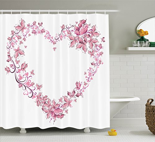 Ambesonne Love Decor Collection, Floral Love Shape Heart of Butterflies Valentine Day Flowers Ornamental Design Print, Polyester Fabric Bathroom Shower Curtain Set with Hooks, Pink Purple White