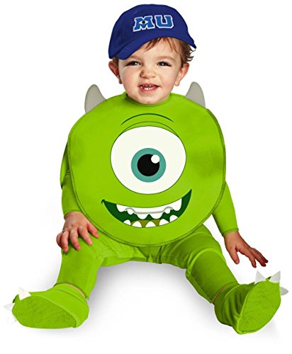 -. Binding : Apparel -. Brand : Disguise -. Color : Green -. Department : boys -. Feature : Available in sizes Infant (6-12 months) and (12-18 months). / This is an officially licensed Disney/Pixar (TM) Costume. / Includes a green jumpsuit, foam character overlay, blue Monster University (MU) hat and booties. -. ProductGroup : Apparel -. ProductTypeName : DRESS -. Title : Monsters University Mike Baby Costume
