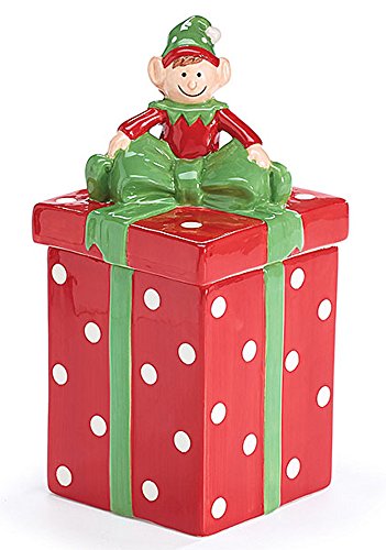 Hand-painted ceramic cookie jar is a red present with white dots and a green bow on top. Elf looks like he is popping out of the bow. Rubber seal for lid.