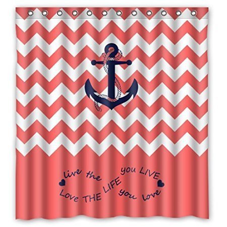 BMALL Infinity Live the Life You Love, Love the Life You Live.Coral and white Chevron Zig Zag Pattern with Anchor Waterproof Bathroom Fabric Shower Curtain Shower Rings Included 66 x 72 Inch