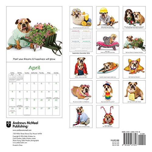 -. Feature : Full of attitude and wit, the Zelda Wisdom 2017 Calendar offers life lessons and laughs for every month of the year. / Zelda is the absolutely fabulous and fabulously famous English bulldog who has been gracing the pages of this top-selling calendar for more than a decade. / With her impeccable sense of style and trademark one-liners, Zelda is top dog everywhere she goes. / Zelda has been featured on CBS Sunday Morning, NBC Nightly News, and in Parade magazine and USA Today. / Makes a great gift for friends and family! Dimensions: 12" x 12"