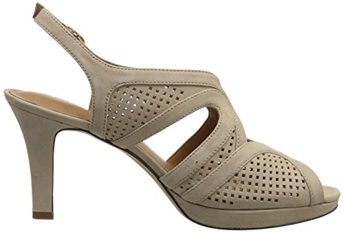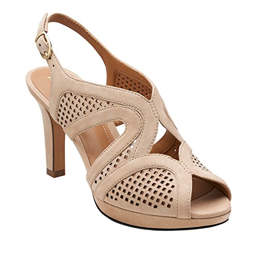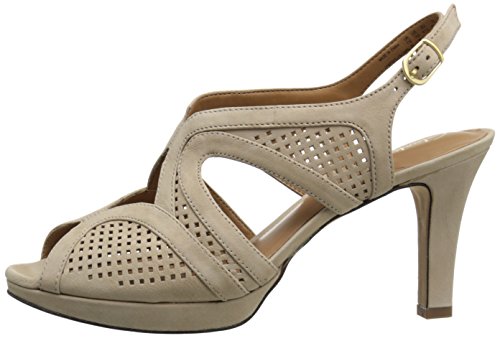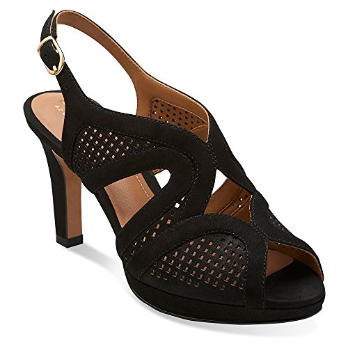 Women's Clarks, Delsie Grace peep toe Sandals These gorgeous sandals will add a sultry touch to your look! Leather upper with decorative perforations and peep toe for added appeal Slingback strap with adjustable buckle closure for a perfect fit Smooth manmade and leather lining Padded footbed for added comfort 3 1/2 inch heel Manmade outsole. Heel Height of 3.50 inches
