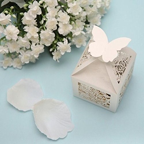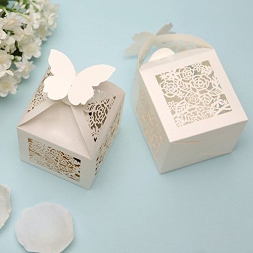 PONATIA 25Pcs/Lot 4''x4'' Laser Cut Pearl Paper Party Wedding Favor Ribbon Candy Boxes Large Size Gift Box for Cupcake (White Rose)