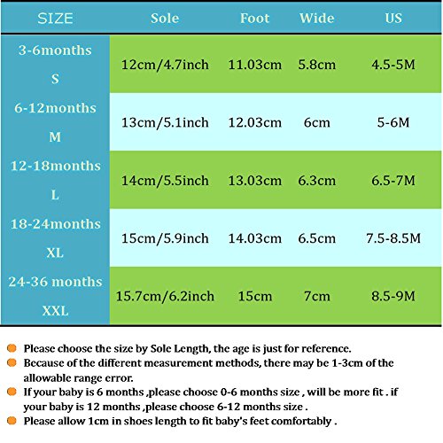 -. Feature : This baby shoes light-weight and durable and fit narrow feet, wide feet, and everything in-between. They are a perfect first pair of shoes. / Slip-on baby shoes look great with or without socks.soft sole slip-on crib shoes have an elasticized ankle designed to ensure the shoes stay on little feet. / Shoes are made from ultra-soft, flexible leathers that bend in all directions for added comfort. These shoes are designed to protect little feet while crawling or walking. They allow feet to move, breathe and grow without being constricting. They are the perfect first shoes for infants, babies, pre-walkers and toddlers. / Soft leather allowing the normal development of the foot/weight-bearing ability/balance . / NOTE :For SIZE, Please measure baby's feet length and refer to our Size Chart , the age is just for reference.