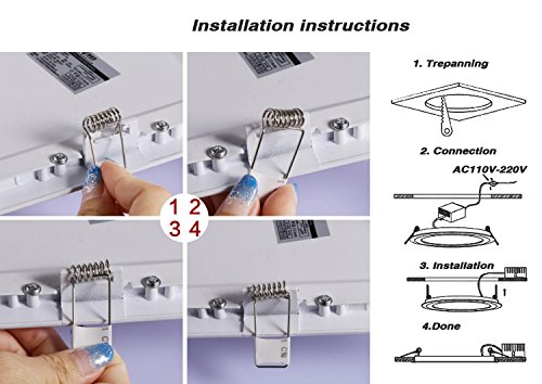 - EASY TO INSTALL - - Turn off the power-Cut a appropriate hole size-Wire the driver of led panel light to electric circuit-Pull up the sprinng clips and put the panel hook on the hole-Adjust the panel to stick the ceiling tightly.