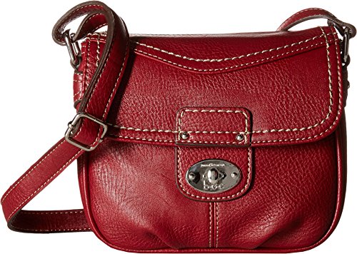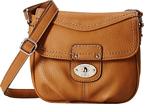 Adjustable crossbody strap. Snap-flap closure. Exterior features slip pocket at front, zip pocket at back, polished hardware, and contrast stitching. Flat, branded base. Lined interior flaunts back wall zip pocket and two slip pockets. Imported.
