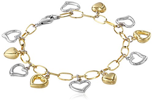14k yellow gold and sterling silver charm bracelet featuring various shaped hearts and lobster-claw clasp