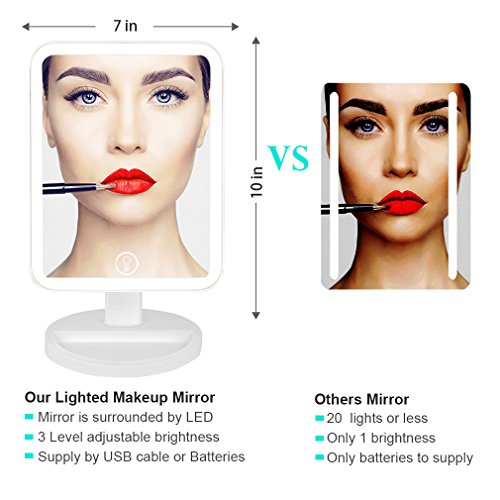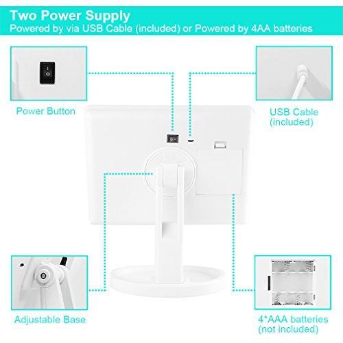 Perfect travel companion : Lightweight and Portable.The weight of this mirror is just 600g.It folds well and easily to store when traveling. Power with the USB cable (included) or 4 AA batteries(not included) .