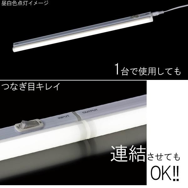 | 器具の端まで光るので、つなぎ目の光が途切れません。連結は付属コネクター使用で最大6台まで可能。取付簡単、工事不要!!設置方法はマグネット取付けとネジ取付けから選べます。店内のスポット照明や棚下照明におススメです。 |