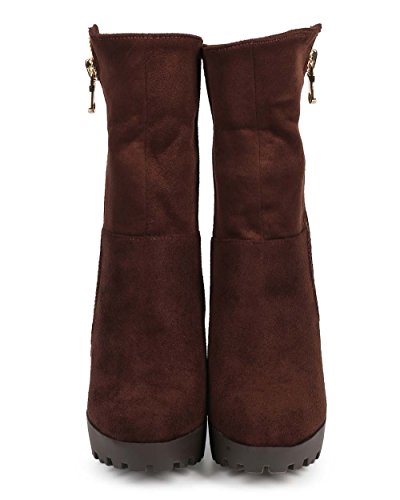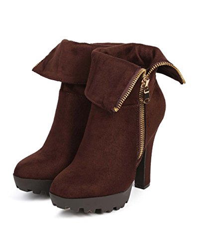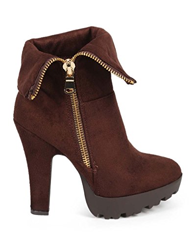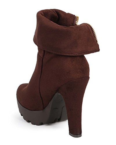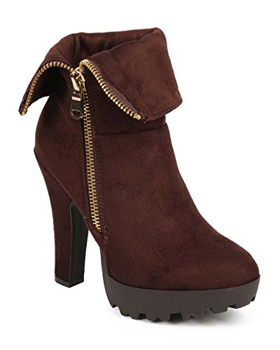 Wild Diva DE17 Women Suede Almond Toe Chunky Heel Foldover Platform Bootie - Brown